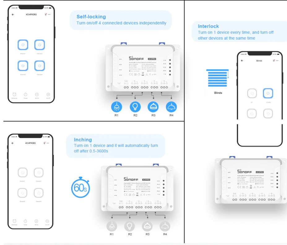 Det er en 4-kanals universal WiFi trådløs smart switch til dit smart home-system til eksternt og automatisk at tænde / slukke for husholdningsapparater og elektroniske enheder til Android / iOS App eWeLink eller 433MHz RF Remote.