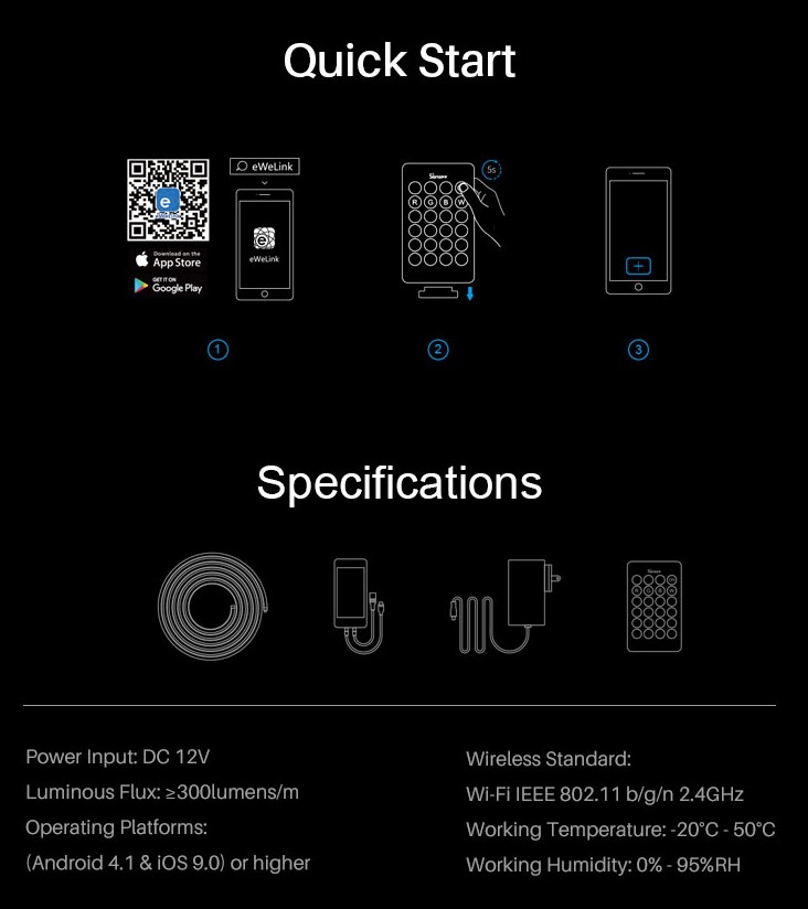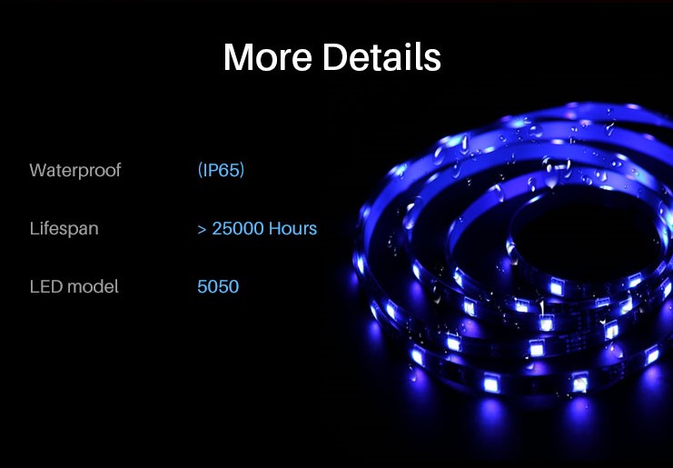 Det er nemt at installere med en afskærbar og fleksibel LED-strimmel, og den IP65-vandtætte LED-lysstrimmel kan også bruges til udendørsbelysning. Bare tryk på eWeLink-appen for at vælge farven med dit smarttelefonkamera for at synkronisere farven på Smart LED Light Strip, eller brug stemmestyring med Google Home eller Alexa til at spille med 16 millioner farver. Denne dæmpbare Smart LED-lysstrimmel har standardbelysningstilstande, der kan imødekomme dine funktionelle og dekorative behov, mens DIY-funktionen antænder din dekorativ kreativitet. L1 Smart LED Light Strip leveres med et smart Wi-Fi-controller-sæt, en 5050 RGB LED-lysstrimmel, 5m og et strømforsyningssæt.