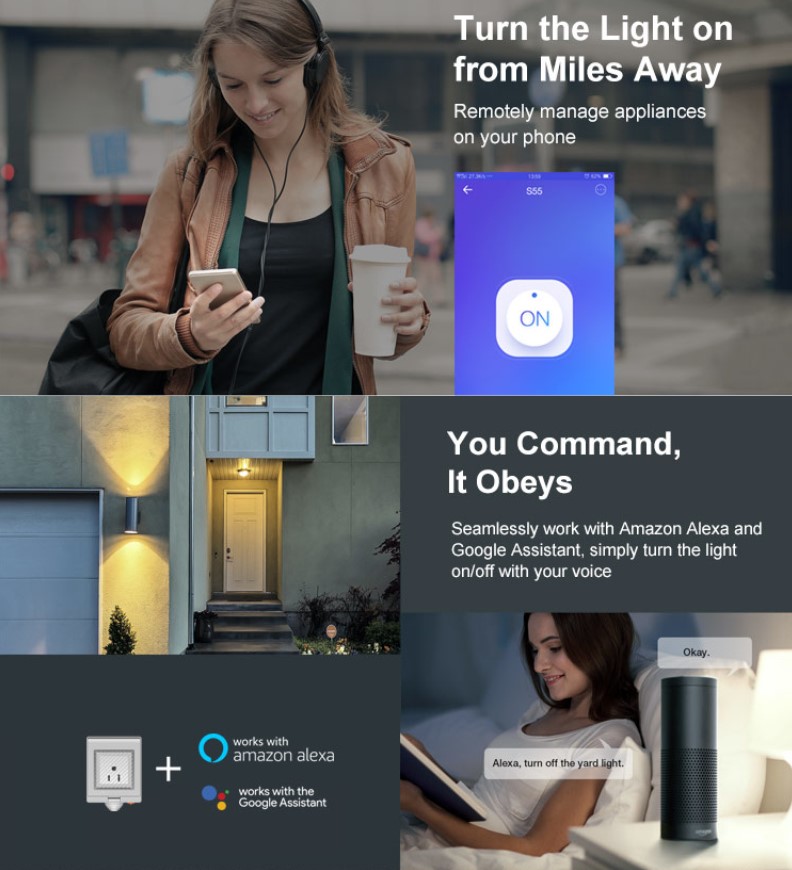 SONOFF S55 er en praktisk vandtæt Smart Socket, der kan oprette forbindelse til dit Wi-Fi-netværk i hjemmet og få dig til at administrere og programmere enheder langt fra med din telefon eller tale via Amazon Alexa eller Google Assistant. Vedtager kraftigt IP55 vejrbestandigt materiale, så det er robust og sikkert, når du bruger det udenfor. Tilpas tidsplaner for enheder, så de automatisk kan tænde / slukke efter dine behov, uanset hvor du er. Perfekt til forskellige lejligheder som have, gårdhave, open-air restaurant og mere. Let at installere.